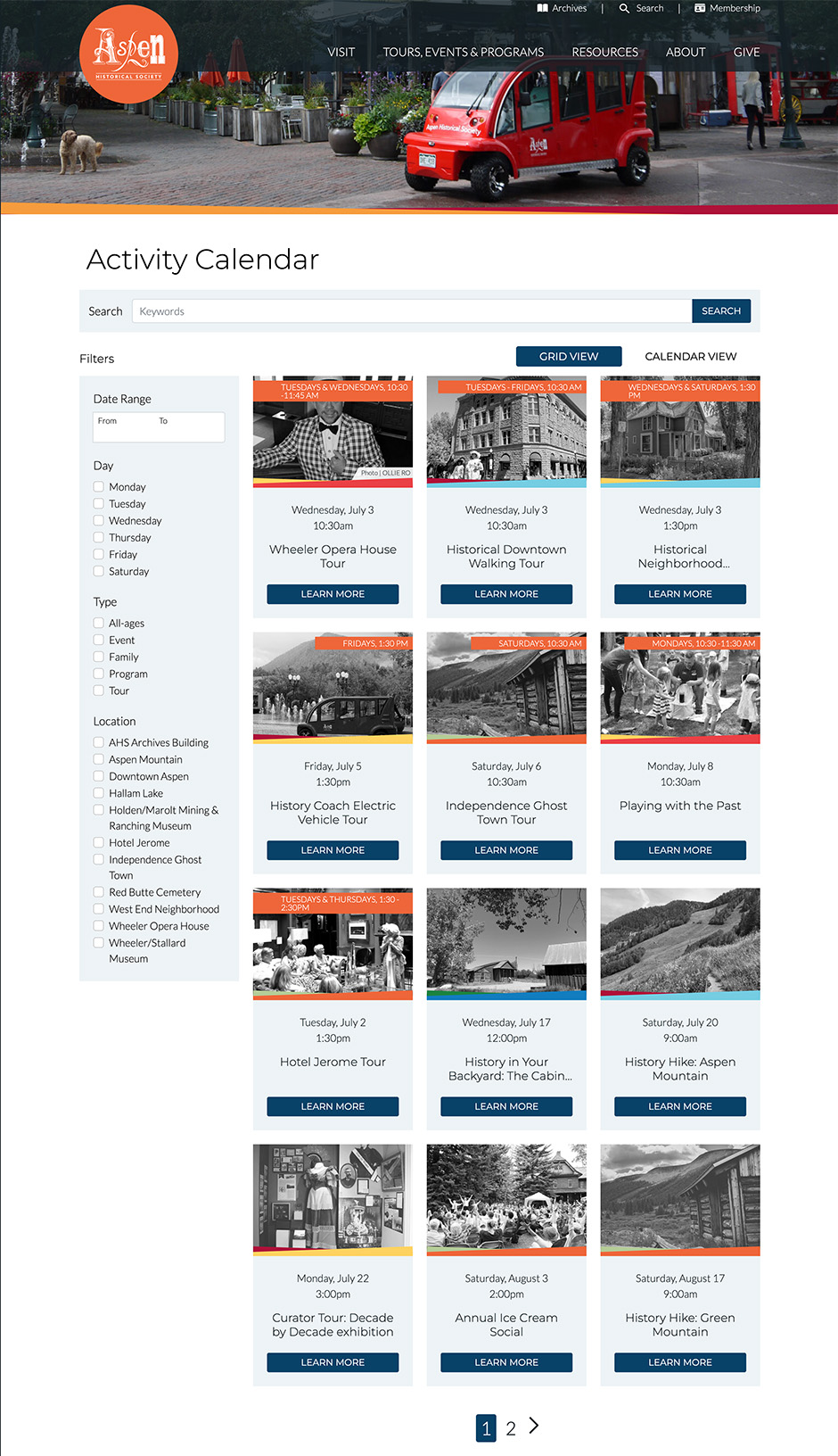 We present Aspen Historical Society's events and activities up front in a straightforward, engaging manner. Our approach includes a bespoke, simple-to-use, and robust event management system on the back end. The front end user interface is engaging and easy to navigate.